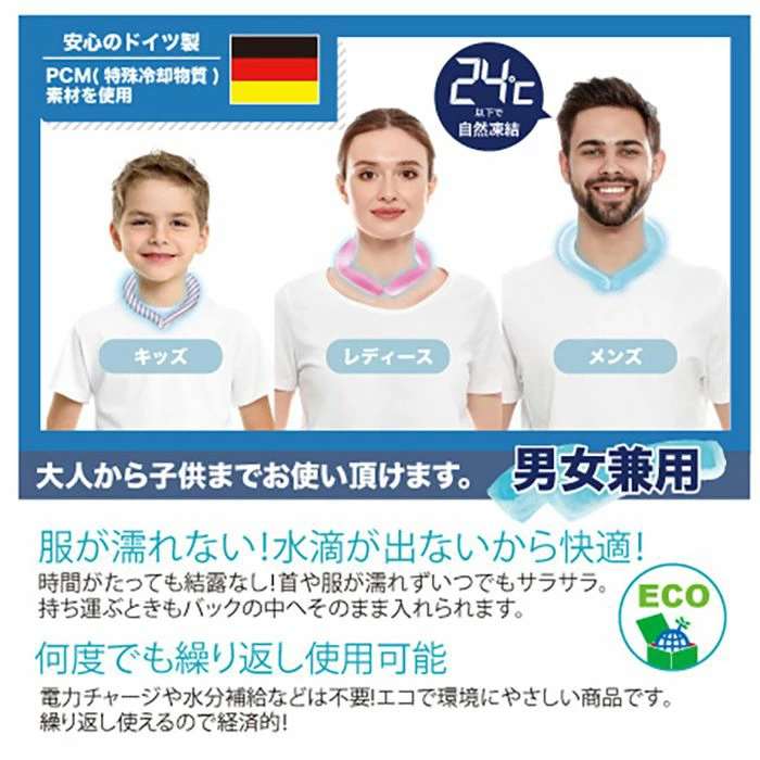 首元ひんやり快適。カラーは、ギンガムチェックブラック(JAN:4570060533481/品番:-)です。夏の熱中症・暑さ対策に!スポーツ・通勤通学・屋外作業・アウトドア、色んなシーンで使えます!電力チャージや水分補給などは一切不要!何度でも繰り返し使えて、エコで環境に優しい商品です。服が濡れない!水滴が出ないから快適!時間がたっても結露なし!首や服が濡れずいつでもサラサラ。持ち運ぶときもバッグの中へそのまま入れられます。宇宙飛行士を急激な温度変化から守るために開発されたPCM(特殊冷却物質)素材を使用。中身が解けて液体になったら、たった20分で凍結!本製品は21度以下で自然凍結!冷凍庫なら20分・冷水で30分。※冷却時間や持続時間は環境によって異なる場合がありますので、目安時間より長めの冷却をおすすめします。※21度以下で凍結が始まるため、結晶が商品内に浮遊することがありますが、不純物ではありません。