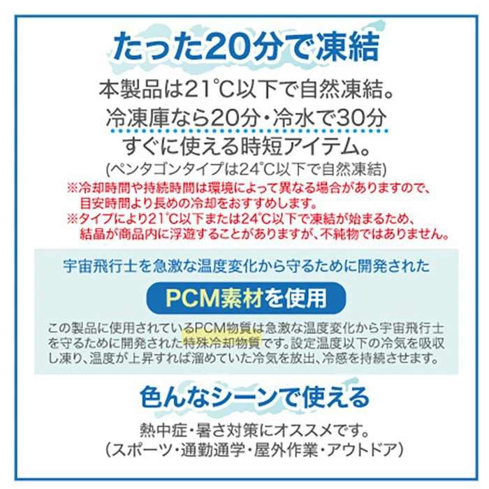 首元ひんやり快適。カラーは、ストライプピンク(JAN:4570060533573/品番:-)です。夏の熱中症・暑さ対策に!スポーツ・通勤通学・屋外作業・アウトドア、色んなシーンで使えます!電力チャージや水分補給などは一切不要!何度でも繰り返し使えて、エコで環境に優しい商品です。服が濡れない!水滴が出ないから快適!時間がたっても結露なし!首や服が濡れずいつでもサラサラ。持ち運ぶときもバッグの中へそのまま入れられます。宇宙飛行士を急激な温度変化から守るために開発されたPCM(特殊冷却物質)素材を使用。中身が解けて液体になったら、たった20分で凍結!本製品は21度以下で自然凍結!冷凍庫なら20分・冷水で30分。※冷却時間や持続時間は環境によって異なる場合がありますので、目安時間より長めの冷却をおすすめします。※21度以下で凍結が始まるため、結晶が商品内に浮遊することがありますが、不純物ではありません。