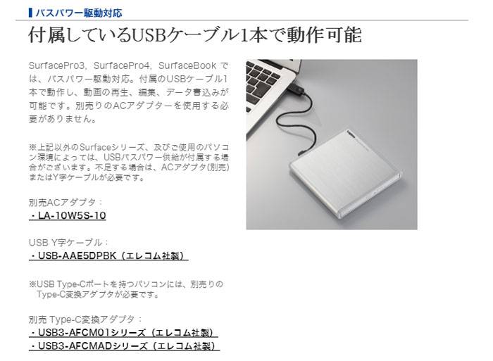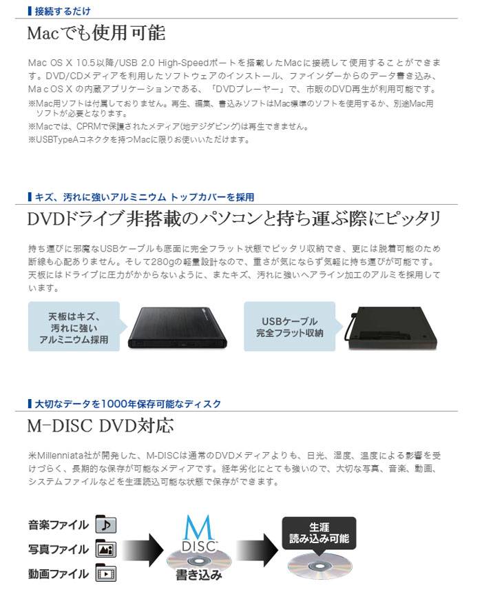 本製品は、SurfacePro3, SurfacePro4, SurfaceBookバスパワー駆動対応した、USB2.0対応ポータブルDVDドライブ、動作再生/編集、書込みソフト付き、ブラックモデルです。トップカバーにアルミニウム素材を採用し、プラスチックでは出せない高級感のある質感を実現し、キズや汚れに強いデザインといたしました。超コンパクトドライブを採用することで、奥行を13.4cmまでコンパクト化を実現。ノートPCと一緒に安心して持ち運んで使える、DVDメディア全種類完全対応のハイパーマルチドライブです。USBケーブル1本のバスパワー駆動で、ケーブルは背面へ格納する事ができるポータブルタイプでいつでもどこでも使えます。※お使いのPCによってはバスパワーが不足します。その場合は別売りACアダプタが必要となります。本ドライブは無駄な消費電力を抑えた設計になっており、省電力化を実現。PCのバッテリも長持ちさせることができます。「Mac OS X」/USB 2.0 High-Speedポートを搭載したMacに接続して使用することができます。※Mac用ソフトは付属しておりません。※USBTypeAコネクタを持つMacに限りお使いいただけます。最新のブロック暗号であるAES形式を採用した、万全のセキュリティでディスクを保護する事ができます。長期保存メディア、M-DISCへの書き込みに対応し、パソコン内の大切なデータを、信頼性の高いM-DISCへバックアップする事が可能です。CyberLink社製、Power2Go8 for DVD(書込)、PowerDVD12 for DVD(再生)、PowerDirector10 for DVD (動画編集)のオールインワンソフト添付。Windows8以降、OS標準で対応していない、地デジ録画、DVD Videoなどの著作権保護のかかった動画などを再生する事が出来ます。カラーバリエーションは、ブラック(JAN:4580333564791 品番:LDR-PMJ8U2VBK)、ホワイト(JAN:4580333564807 品番:LDR-PMJ8U2VWH)です。
