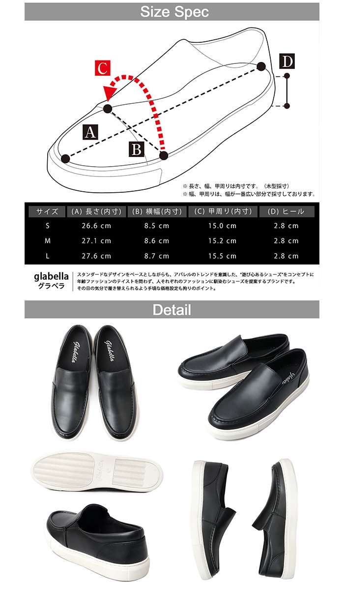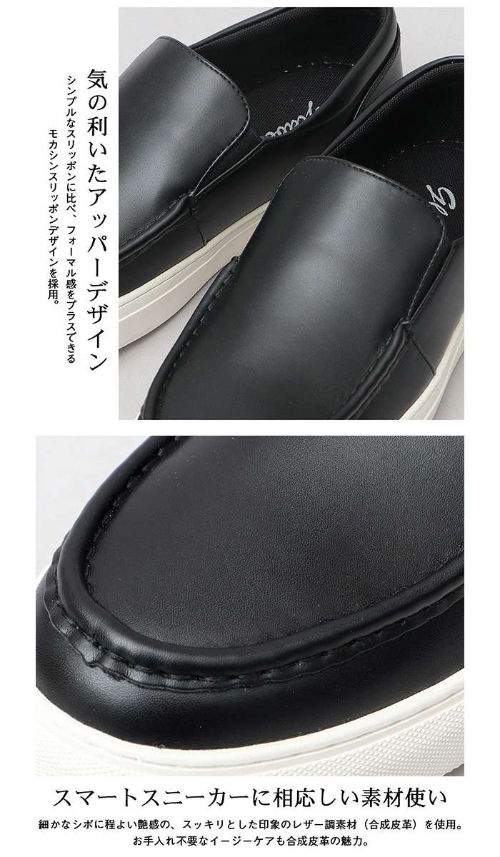 ◆オンオフ対応!大人のスマートスニーカー(モカシン)◆フォーマルからカジュアルまで、様々なスタイリングに合う、モカシン仕様のスリッポンスニーカー。無駄を極限まで削ぎ落したミニマルなデザインは、スマートなシルエットと相まって大人な雰囲気。スニーカーでありながらも、品のある大人の足元を演出してくれます。また、レザー調のスマートスニーカーとしては珍しく、内側全面にメッシュ素材を採用し、大人な見た目と、スニーカーならではの履き心地を兼ね備えた逸品。■オンオフ対応可能なスマートスニーカー■フォーマルからカジュアルまで、オンオフ兼用できる大人スニーカー。ややつま先に長さのある木型にミニマルなデザインを合わせたスマートな雰囲気が魅力。■気の利いたアッパーデザイン■シンプルなスリッポンに比べ、フォーマル感をプラスできるモカシンスリッポンデザインを採用。■スマートスニーカーに相応しい素材使い■細かなシボに程よい艶感の、スッキリとした印象のレザー調素材(合成皮革)を使用。お手入れ不要なイージーケアも合成皮革の魅力。■快適な履き心地■内側は全面メッシュ素材を採用。レザー調のスマートスニーカーでありながらも、蒸れにくく快適な履き心地を実現。■クッション性を考慮したインソール設計■クッション性の高い低反発インソールとスポンジを組み合わせたインソールは、足裏をソフトに包み込み疲れを軽減。セットアップなどのオフィスカジュアルスタイルから、普段のカジュアルスタイルまで、幅広く合わせやすい、シンプルなデザインが良いです。大人っぽいスタイリングをしたいけど、革靴が苦手な方にもオススメ!シャツやポロシャツ、ジャケットなどの襟付きの服と、細身のスラックスやチノパン、デニムと合わせて、簡単に清潔感のある大人スタイルが完成します。