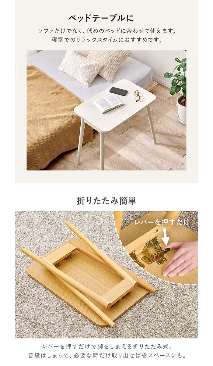 ソファに座ってのパソコン作業や読書にピッタリな高さ。作業スペースは確保しつつコンパクトに折りたためて移動や収納にも便利。